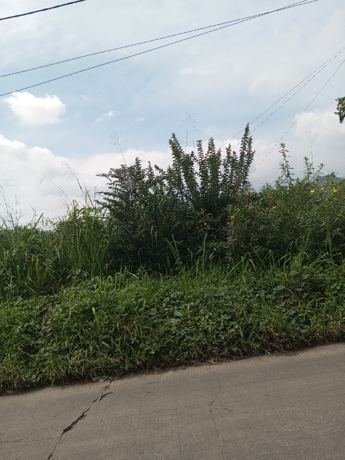 An outdoor scene in Namthoung, Laos, depicts a cracked, grey asphalt road surface occupying the lower third of the frame, ascending slightly towards the right. Adjacent to the road, an overgrown embankment rises, densely covered with various green vegetation, including tall grasses, leafy shrubs, and ground cover. Specific shrubs exhibit reddish-pink inflorescences or new growth, while others display small yellow flowers. A small piece of light blue plastic debris is visible on the road near the embankment on the left. In the midground, behind the immediate vegetation, a hazy green hillside is discernible beneath a sky with scattered white clouds. Multiple thin, dark utility lines traverse the upper portion of the frame horizontally and diagonally. No individuals or discernible actions are present.