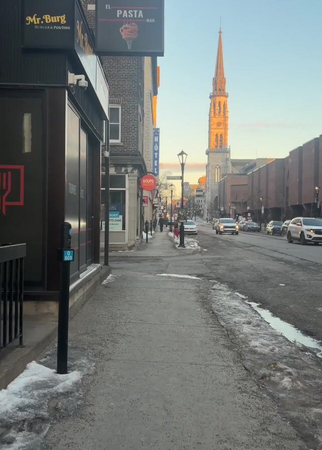 sidewalk view of a street in Quebec, Canada. On the left is a restaurant with signs for "Mr. Burg Burgers & Poutine" and "El Pasta Man." The sidewalk is grey and partially covered with patches of ice and melting snow. On the right side of the street, cars are driving on a wet road with remnants of snow. A tall, golden-colored church spire is visible in the distance. Various buildings, including a hotel, line the street. There are a few pedestrians visible further down the sidewalk.