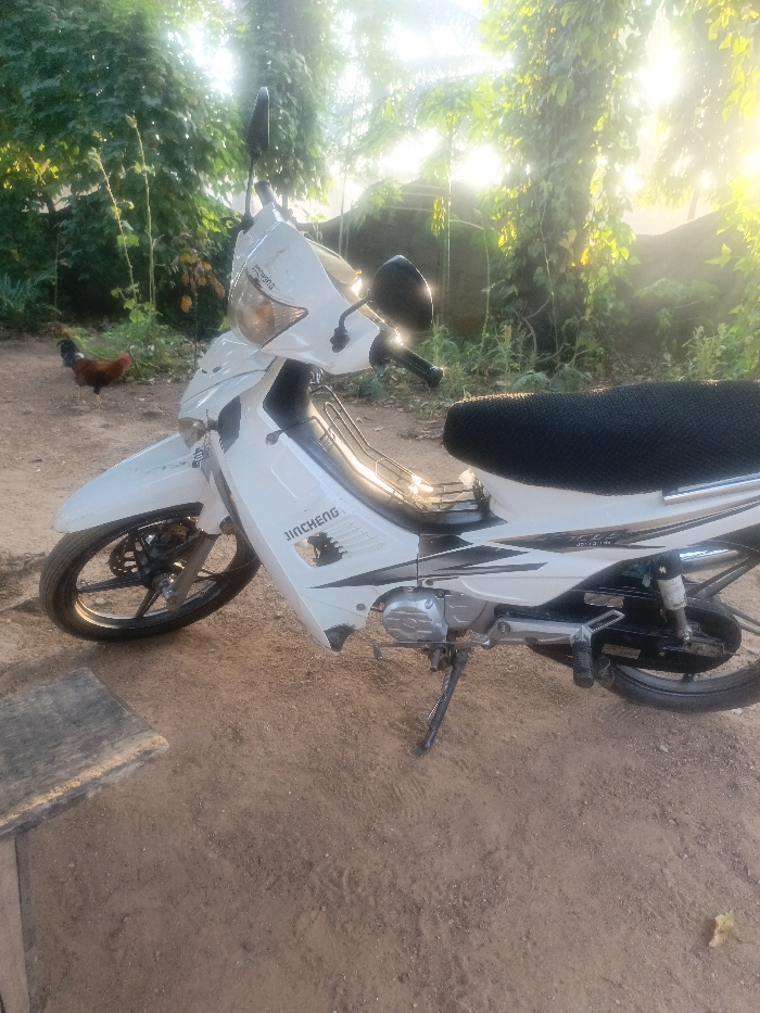 A white JINCHENG motorcycle is parked on a reddish-brown dirt surface in Akwanga, Nigeria