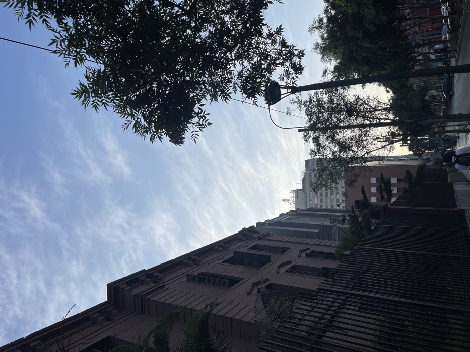 This image depicts an urban street scene in the Historic Center of Lima (Cercado de Lima), Peru, observed during what appears to be early morning or late afternoon. On the left, a multi-story building constructed of dark red/brown brick occupies the foreground and midground. This building features multiple rectangular windows with dark, louvered shutters and prominent decorative brick cornices dividing its floors and defining its roofline. A tall, dark metal fence runs along the building's base, partially obscuring green foliage, including palm fronds, behind it. The sky overhead is a light blue with scattered, wispy white clouds. In the right foreground, the dense, dark green canopy of a tree obscures the upper right corner of the frame. Below it, a tall, dark street lamp with a circular luminaire is visible. Additional trees, mostly silhouetted, line the street extending into the background. The street itself is wide, with a sidewalk on the left and a paved roadway on the right, where several vehicles, including cars, are visible in the distance, both parked and in motion. On the right side of the street, further down, several multi-story buildings of varying styles and colors are present, including one that appears light brown or orange. In the background, positioned centrally, a tall, light-colored, multi-story building with a flat roof is clearly visible, topped with an array of communication antennae and other equipment. On the sidewalk in the lower-center of the image, one individual is seen walking away from the camera. This person wears a light-colored shirt, dark pants, and carries a dark backpack. No direct interactions are discernible. The light suggests a low sun angle, casting subtle shadows and illuminating the cloud formations.