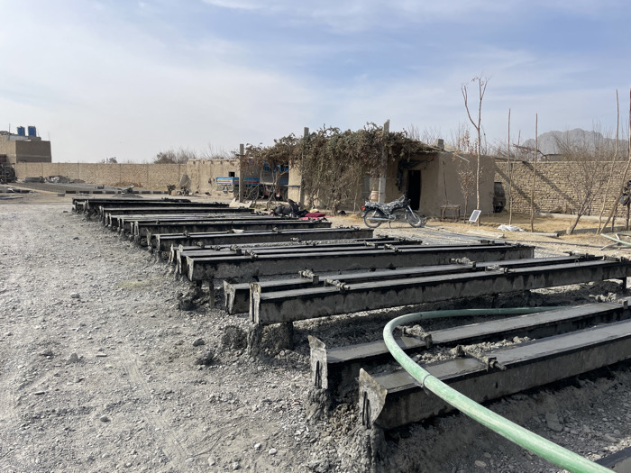 The image depicts an outdoor concrete manufacturing site in Nakhonay, Afghanistan, under a clear sky