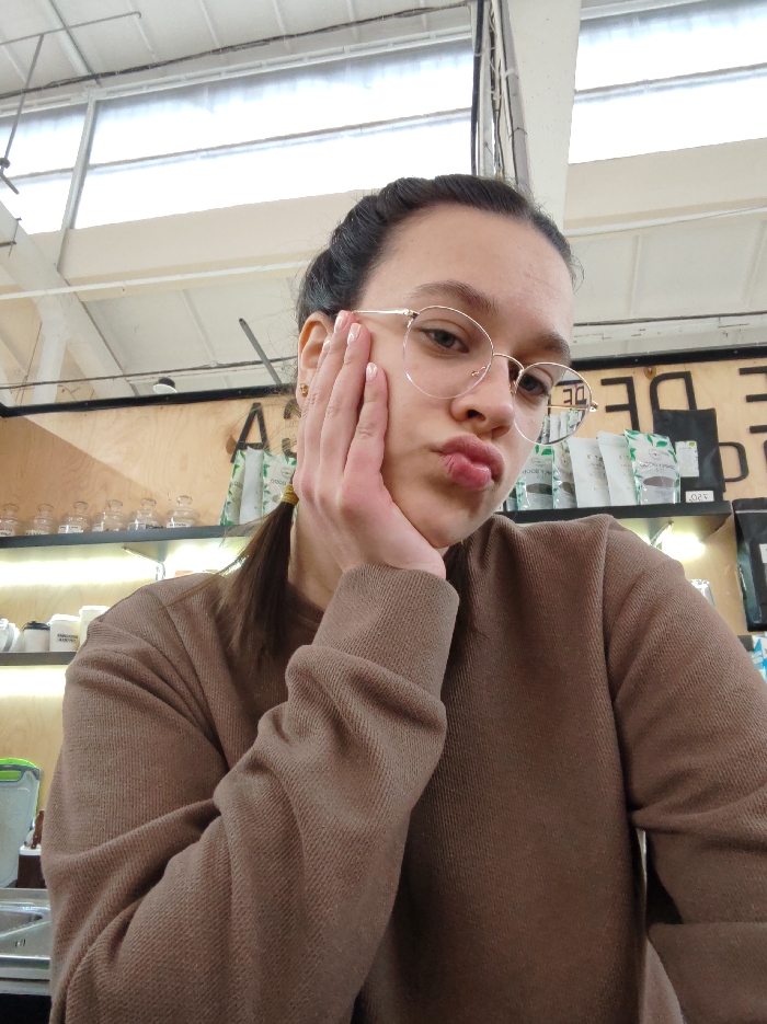 A person wearing glasses and a brown sweatshirt rests their cheek in their hand with pursed lips. They have dark hair pulled back in a ponytail with a yellow hair tie. Behind them is a shelf lined with glass containers and other merchandise. Natural light filters in through the windows above.