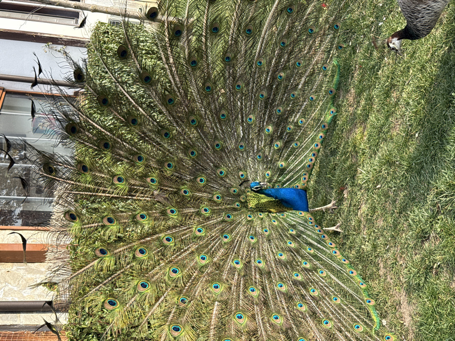 The scene is an outdoor daytime shot in Krasnovo, Bulgaria. A male peacock (Pavo cristatus) stands prominently in the center, facing slightly right, with its iridescent blue neck and head visible. Its large, fanned-out display tail, composed of numerous elongated green-brown feathers with prominent iridescent blue and green "eyespots" (ocelli), dominates the upper and central portions of the frame. The peacock's feet are visible on the grassy ground. In the lower right foreground, a partial view of a female peahen (Pavo cristatus) is present, facing right, displaying grey-brown plumage with a lighter head and dark markings. The ground is covered in green grass with some sparse patches. In the background, behind the peacock's tail and foliage, a light-colored building with dark-framed windows is partially visible. Several small, dark, bird-shaped silhouettes or decorative figures are suspended on thin wires, appearing to fly against the building and greenery.