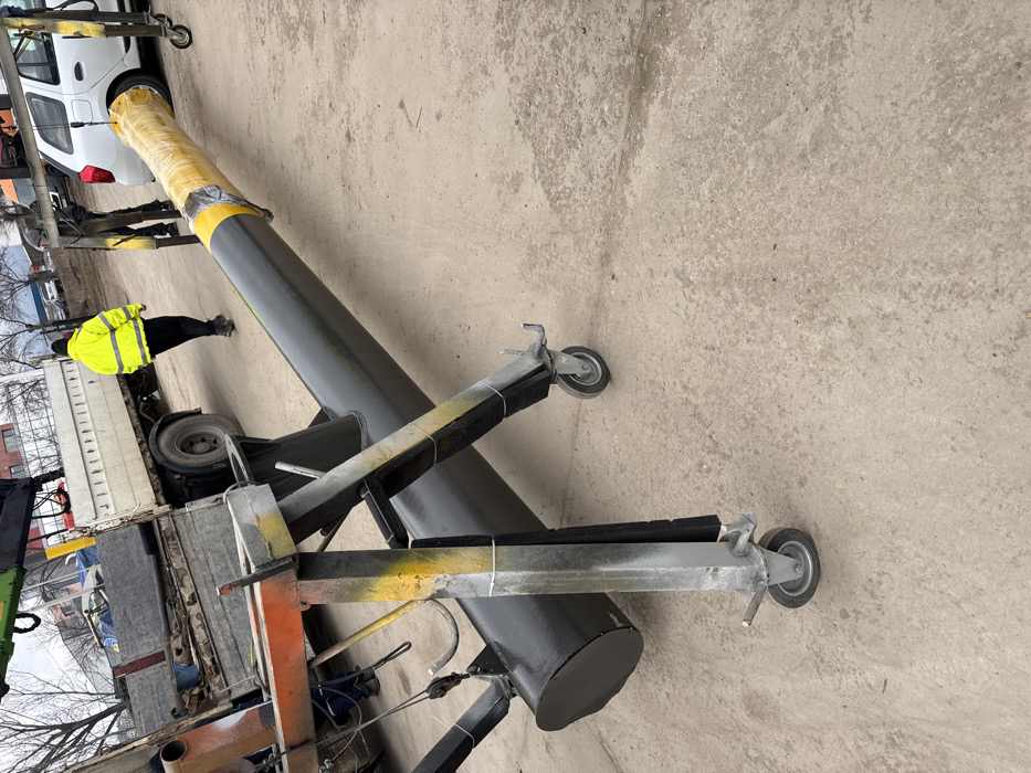 The scene depicts an outdoor industrial or construction area in Lozen, Bulgaria, under an overcast sky. A large, dark grey cylindrical metal structure, possibly a pipe or auger component, lies horizontally across the foreground and midground. Its near end is blunt and closed, while the far end is wrapped in bright yellow protective material, secured with tape. The structure is supported by at least two mobile, wheeled stands; the prominent stand in the foreground is silver-grey metal with faded yellow and black painted stripes, equipped with two visible caster wheels. A white flatbed truck with an extended green hydraulic crane arm is positioned on the left side of the image. Its bed contains various tools and equipment. A white hatchback car is parked on the right, behind the far end of the cylindrical structure. Three adult males are visible. One male, wearing a bright yellow high-visibility jacket and dark pants, walks away from the camera towards the left background. Another male is partially visible near the truck, and a third male is partially visible near the white hatchback, adjacent to the yellow-wrapped end of the cylindrical structure. The ground consists of uneven, light brown-grey dirt or gravel. In the background, distant low-rise buildings and bare trees are discernible.