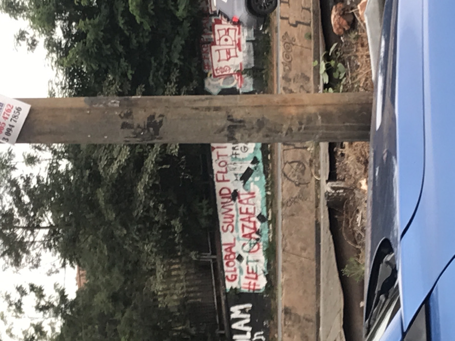 The image depicts an urban street scene under an overcast sky. In the foreground, the hood and windshield area of a blue vehicle, showing some surface wear, are visible. In the mid-ground, a weathered, dark brown utility pole stands vertically on the right, extending from below the frame upwards. Attached near its top is a white rectangular sign with black text, partially displaying phone numbers "005 4762" and "3 094 7856". Behind and to the left of the pole, a low concrete barrier runs horizontally, exhibiting faint graffiti. Above this barrier is a larger, dark-colored wall featuring multiple graffiti pieces. On the left, white text ending in "LAM" is visible on a black background. To its right, a mural with red text "GLOBAL SUMUD FLOTI" and "#LETGAZAEAT" is painted on a white and light blue background, partially covered by several dark, irregular patches. Further right on the wall, abstract red and white graffiti is present. The rear portion of a grey SUV is visible behind the pole and wall, indicating a road or parking area. The ground below the concrete barrier is uneven, containing dry vegetation, debris, and small green plants. The background is dominated by dense green foliage, with a reddish-brown structure faintly visible through the trees on the upper left. There are no individuals depicted in the scene. The specific location within Johannesburg, South Africa, cannot be determined from the visual information provided.