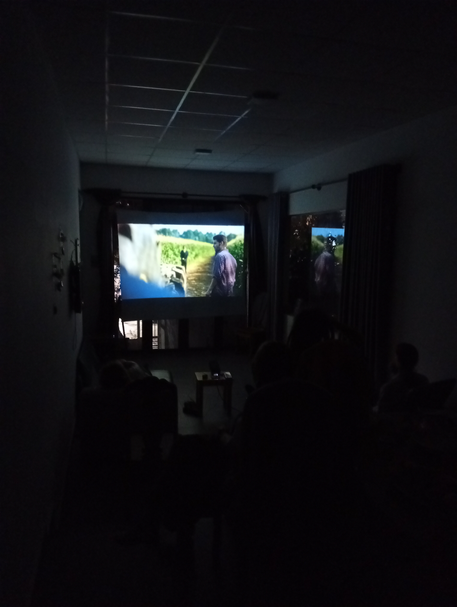 An interior view depicts a dimly lit room in Da Lat, Vietnam, functioning as a viewing area for a projected video. A large rectangular screen at the far end of the room displays a scene featuring a male individual in a plaid shirt standing amidst a field of tall green crops under a bright sky. The projected image is also visibly reflected on a large window or glass door immediately to the right of the screen, indicating an external view or an adjacent space. Multiple dark, silhouetted figures, indistinct in detail, are seated or reclining in the foreground and midground, facing the projection screen. These figures occupy various seating arrangements, with at least three individual forms clearly discernible. A low, dark table is present in the midground to the right, positioned in front of some of the seated figures, with a small object resting on its surface. The ceiling features a grid-patterned tile structure. The overall environment is dark, with the primary illumination originating from the projected image.