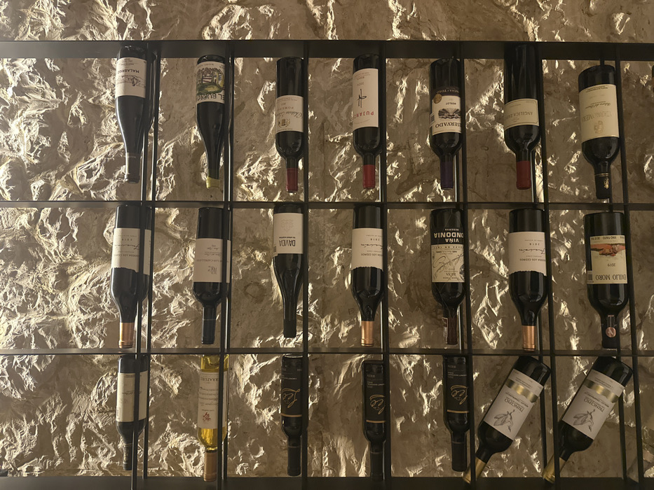 The image displays a wall-mounted wine rack in an indoor setting within the city of Monterrey, Mexico