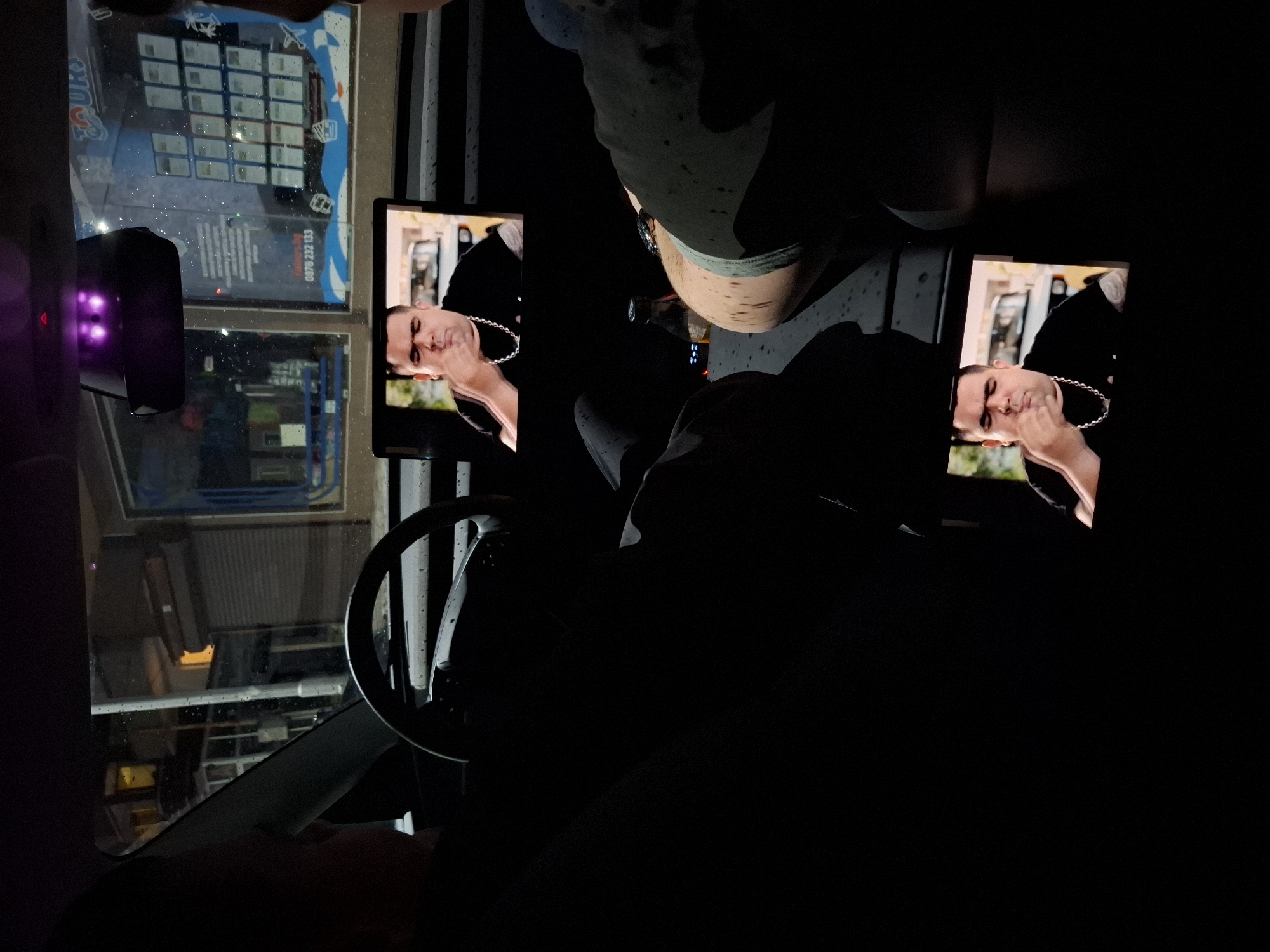 The image captures the interior of a parked vehicle at night, looking out onto a street in Velingrad, Bulgaria, during or immediately after rainfall, evidenced by water droplets on the windshield. Within the vehicle, two individuals are partially visible: a driver, whose silhouette is on the far left, and a front passenger, whose lower body, including legs and a watch on the left wrist, is visible on the right. A prominent central infotainment screen on the dashboard displays a close-up image of a heavy-set man with short dark hair, wearing a black t-shirt and a silver chain. His hand is raised to his chin or mouth, conveying a contemplative expression. An identical image of this man is displayed on a second, smaller screen positioned lower in the vehicle, possibly a tablet. A brown bottle and a small electronic device are situated on the center console area, between the passenger's legs. A rearview mirror with a faint purple light is mounted at the top of the windshield. Through the windshield, a brightly lit storefront is visible. It displays a partial "TOURS" sign, a grid of brochures or advertisements, and the Bulgarian phone number "0876 232 133" along with "maturs.bg" text on its window, identifying it as a travel agency. Adjacent to this shop, a building with a closed metal security shutter is present. Various other dark buildings and streetlights are discernible in the background, contributing to the nighttime urban environment.