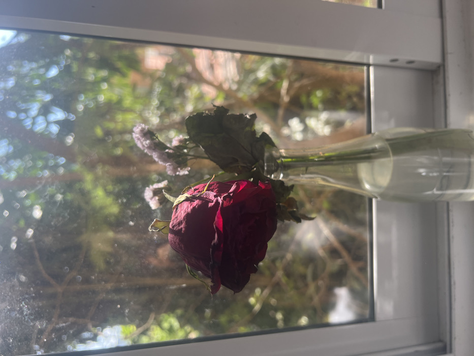 A wilted red rose head droops in a clear glass vase. The rose's leaves are dry and dark. Behind the vase, a window reflects a blurred, sunlit scene of trees and a building. The window frame is white, and light streams through the glass, creating reflections and highlights on the dusty surface. The image evokes a sense of decay and nostalgia.