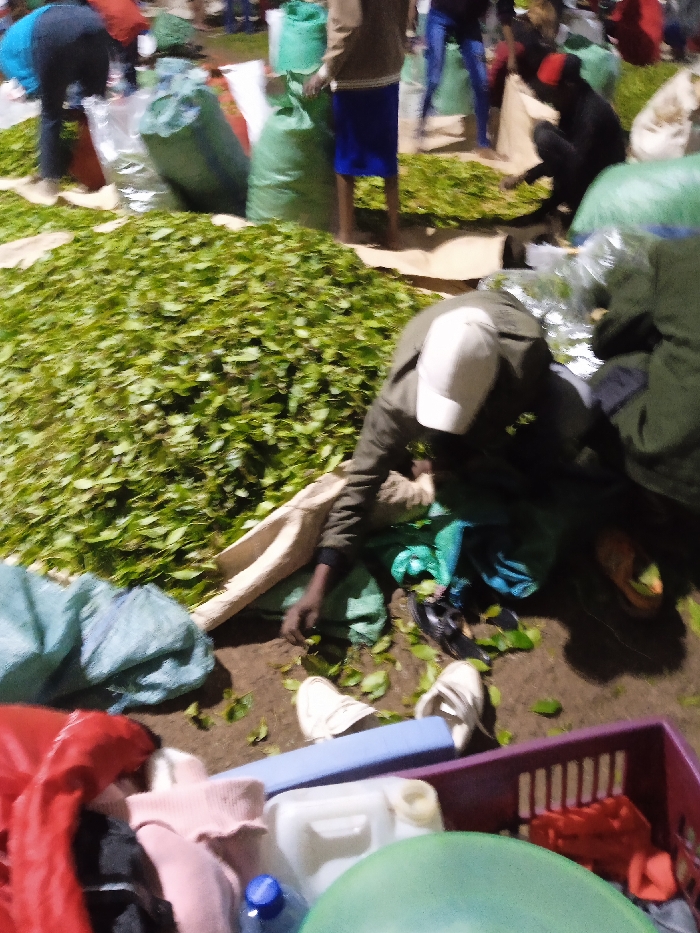 A bustling market scene unfolds with mounds of green leaves dominating the foreground. People are actively sorting through the leaves, packing them into bags. Several large sacks filled with leaves are visible. Amidst the activity, personal items such as shoes, clothes, water bottles, and containers are scattered around, suggesting a long day of work. The ground is strewn with leaves, contributing to the lively and busy atmosphere.