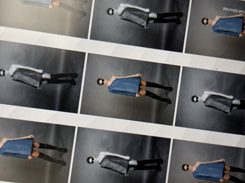 The image displays a grid of fashion shots featuring models wearing short dresses and thigh-high boots. Some dresses are denim blue, while others appear in black or gray leather. The models are positioned against a blurred, dark background, with varying angles and orientations within each square grid segment. The photos seem to be part of a printed page or display, possibly from a fashion catalog or magazine.