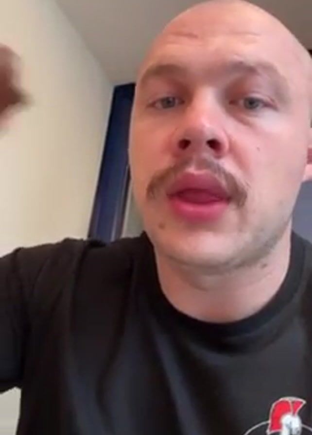 A man with a shaved head and a mustache is looking directly into the camera, framed from the chest up