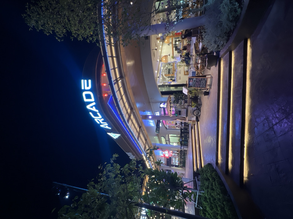 The image displays a brightly lit outdoor commercial complex at night in Baan Chaweng, Thailand. A prominent modern building features a curved upper facade with a large, illuminated blue neon sign spelling "ARCADE". Below this sign, red decorative lanterns are affixed. An extensive canopy, equipped with embedded lighting, extends over the building's ground level. In the foreground, a paved plaza area includes a series of four steps, each illuminated by warm strip lighting, ascending towards the main building entrance. On the left side of the plaza, multiple illuminated storefronts are visible, including partial signage for "KFC" and "TACO BELL". To the right, an open-front restaurant or bar, identified by a "BAR GRILL" sign, contains both indoor and outdoor seating areas. Several individuals are seated at tables within this establishment, engaged in dining or socializing. Positioned centrally near the steps is a mobile vendor cart topped with a thatched umbrella, accompanied by a chalkboard menu stand. Trees and shrubs, adorned with numerous string lights, are strategically placed in planters along the pedestrian path. Additional individuals are observed walking near the storefronts. The entire scene is illuminated by various artificial light sources against a dark night sky.