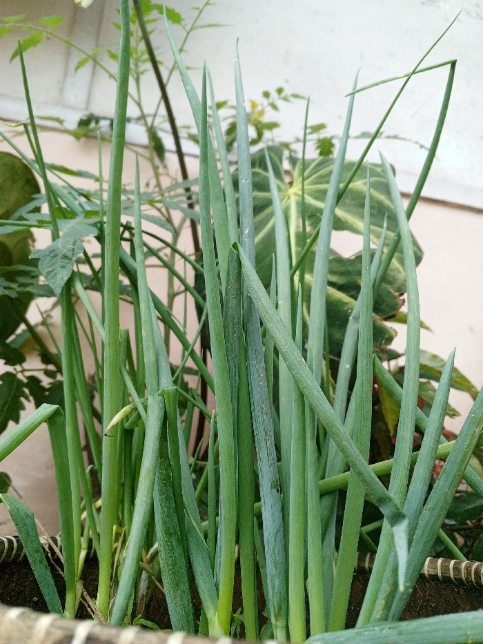- "A vertical, medium-close-up photograph depicts a dense cluster of green, tubular-leaved plants, consistent with green onions or chives, growing in a woven planter" by FM-Yc0yt1, licensed under CC BY 4.0