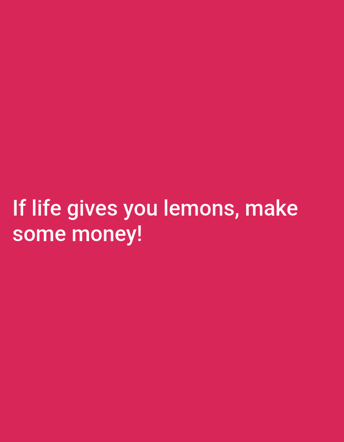 The scene depicts a digital graphic on a solid magenta background. White, sans-serif text is presented in the lower-left quadrant of the image. The text reads: "If life gives you lemons, make some money!". No individuals, objects, or environmental features are present beyond this textual display. The location is Unknown, Unknown.