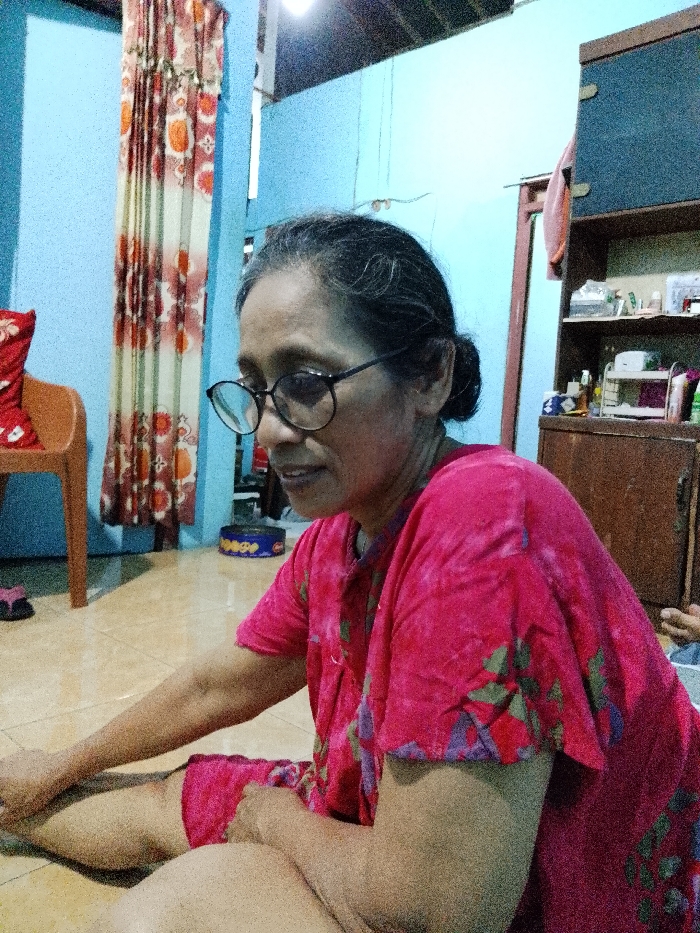 An adult female, estimated to be middle-aged or older, with dark hair tied back, is seated on a light brown tiled floor within an interior space in Kecamatan Pati, Indonesia