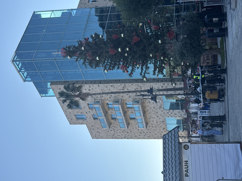 The scene depicts an outdoor public square in Budva, Montenegro, under a clear, light blue sky. In the background, a multi-story building features a light-colored stone facade with a visible section containing three balconies, each equipped with light blue glass railings. Adjacent to this, a taller, modern structure with a full blue-tinted glass facade rises prominently, reflecting the sky. A tall palm tree stands between the two building sections. To the right, a large evergreen Christmas tree, decorated with numerous red heart-shaped and golden spherical ornaments, is positioned in front of the glass building. The foreground shows a paved ground surface. On the left, a white wooden market stall with a dark tiled roof displays a sign reading "PAUN MONTENEGRIN CRAFT BEER." An individual in light blue attire and a white face mask is seen near this stall, looking down at a surface. The central area of the square is arranged with multiple dark high-top tables and stools, indicative of an outdoor event or market. A dark street lamp with two globes is visible. Approximately 10-15 individuals are present; some are standing around the tables, while others are walking. Two individuals in dark uniforms with yellow high-visibility vests are positioned near dark metal barriers in the mid-right, possibly acting as security or event staff. Several dark outdoor patio heaters are also visible in the mid-ground, near the Christmas tree and barriers. Further market stalls are discernible in the background, one bearing "Budva" text.