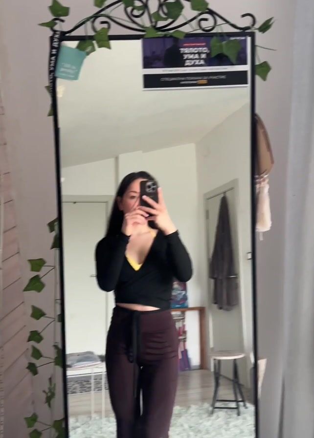 A young woman is standing in front of a full-length mirror, taking a selfie with her phone. She has long, dark hair and is wearing a black long-sleeved crop top over a yellow tank top, and dark brown drawstring pants. The mirror has a decorative black frame with faux ivy wound around it. The room behind her is tidy and has white walls. There is a bookcase with decorative items, a small white stool, and a coat hanging on a door. Soft music is playing in the background. She runs her hand through her hair.