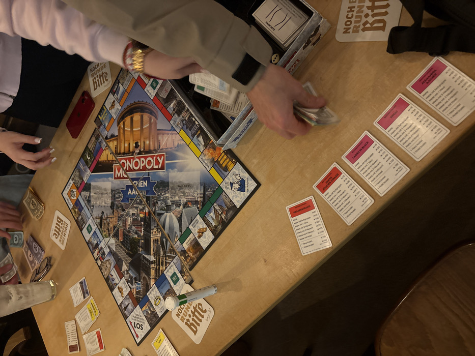 The image displays an overhead view of a Monopoly board game in progress on a light-colored wooden table. The game board is a specialized "MONOPOLY AACHEN" edition, indicating the location is the city of Aachen, Germany. At least three individuals are participating, evidenced by visible hands: one pair (top-left) is handling Monopoly banknotes, another hand (lower-right, with a beige jacket sleeve) is sorting a stack of Monopoly money, and a third hand (mid-right, with multiple gold-colored bracelets) is reaching into the game's white cardboard box to retrieve cards. On the table, several Monopoly property cards from the Aachen edition are laid out face-up, including "KLEINMARIASTRASSE" (red), "ZENTIS JÜLICHES EDELLÄDCHEN" (red), "LADIES IN BLACK" (pink), "TIVOLI" (pink), and "ALEXANDRA AACHEN" (pink). Scattered Monopoly money in various denominations (e.g., green, purple, yellow) is present. A clear glass containing a beverage and ice cubes, a pair of silver-rimmed reading glasses, and a small white cylindrical container with a green cap are positioned on the left side of the table. A red smartphone rests on the table near the board's right edge. Two beige square coasters featuring the German phrase "NOCH EINE RUNDE BITTE" are also visible. The environment suggests an indoor setting, likely a commercial establishment such as a bar or cafe, under moderate lighting.
