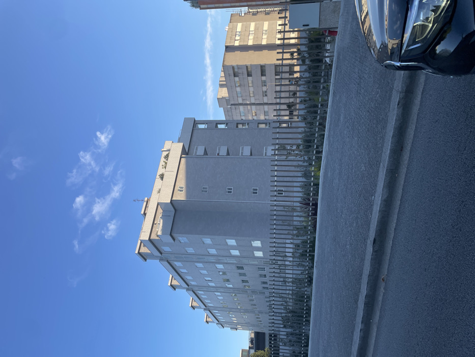 This image depicts an urban street scene in Porto, Portugal, under a clear blue sky with scattered white clouds. The central focus is a multi-story building, approximately seven to eight floors high, constructed of light grey brick or concrete, featuring numerous rectangular windows. The building has a multi-tiered roofline with visible rooftop elements including an antenna and sections of planted greenery. Some balconies are present on the right facade. In the background to the right, a second, lighter-colored multi-story building with multiple windows is visible, partially obscured by the main structure. A dark metal fence, composed of vertical slats, runs across the mid-ground, separating the street from a landscaped area of low shrubs and plants situated in front of the main grey building. In the immediate foreground, a dark asphalt road with a grey curb is visible, bordering a textured grey paved area. The front right section of a dark-colored vehicle, including its headlight and part of the grille, is present in the bottom right corner. A small grey utility box and a red object, possibly a fire hydrant, are positioned on the paved area to the right. The scene is illuminated by strong sunlight, casting shadows on the right side of the main grey building. No individuals are present.