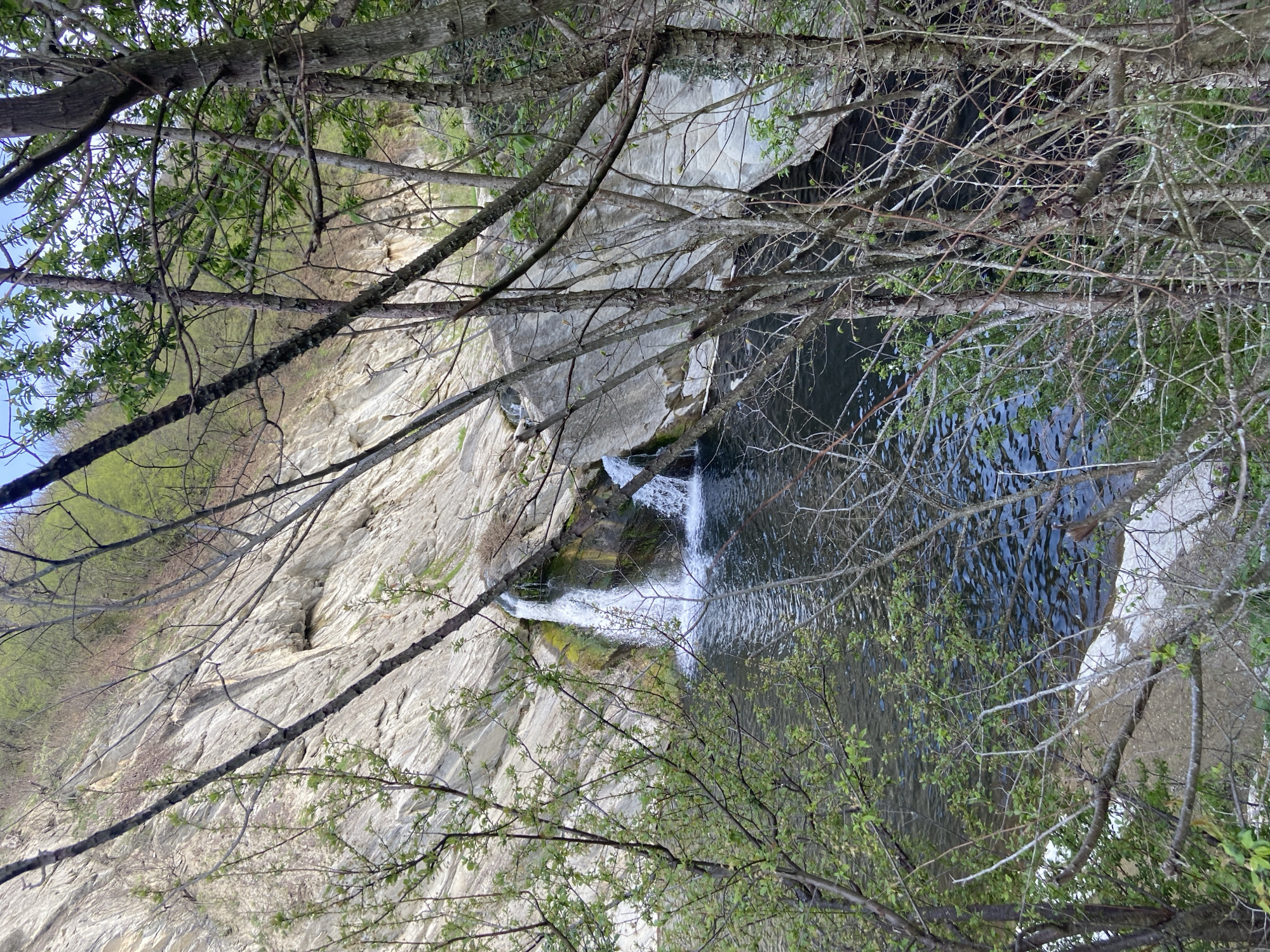 A sideways medium shot of the Kapinovo Waterfall in Kapinovo, Bulgaria. The waterfall cascades down a steep, rocky cliff into a dark pool of water. Bare tree branches and foliage frame the top and right side of the shot, obscuring portions of the view. The left side reveals the white-gray rocky cliff face, descending from the top to meet the waterfall. Patches of green vegetation cling to the cliffside. The sky is visible in the upper left corner, partially obscured by the trees.