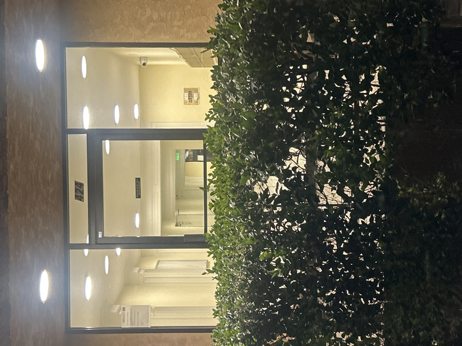 The image displays the illuminated glass entrance of a building at night, viewed from the exterior through a dense green hedge. The scene is situated in the city of Los Angeles, United States of America. The lower half of the frame is occupied by a thick, dark green hedge composed of numerous individual leaves. Above the hedge, a two-story building's entrance is visible. This entrance consists of a central glass door flanked by two fixed glass panels, all framed by dark mullions. Above the glass door, the black numeric address "424" is displayed. The building's exterior wall, visible above and to the sides of the glass entrance, is constructed from a textured, light brown or beige stucco. Through the glass, a brightly lit interior hallway extends into the distance. The hallway features pale yellow walls and a white ceiling equipped with multiple circular recessed lights, casting bright illumination throughout the space. On the interior surface of the left fixed glass panel, a white rectangular document or sign is affixed. Further into the left hallway, white decorative pilasters are visible along the walls, and a large white rectangular object, possibly a poster or framed notice, hangs on a distant wall. On the right side of the interior, a small white security camera is mounted high on the wall, below the ceiling. Beneath the camera, a bank of horizontally oriented rectangular compartments, consistent with mailboxes or package lockers, is affixed to the wall. To the left of these compartments, a dark rectangular plaque with multiple horizontal slots, possibly an intercom or directory, is visible. Through the central glass door, a black sign reading "PLEASE KEEP THIS DOOR CLOSED" is affixed to the interior side of the door. Further down the interior hallway, a green "EXIT" sign is visible, indicating an emergency egress point. The hallway exhibits a repeating architectural pattern, suggesting symmetry and depth. No individuals are present or visible within the frame. No discernible actions or interactions are depicted. The environment is static, suggesting the entrance to a multi-unit residential or commercial structure.