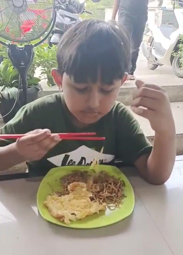 A young boy wearing a green t-shirt that says "Lee Cooper" is seated at an outdoor table. He is eating noodles and a fried egg from a green square plate using red chopsticks. The boy pauses eating at 0:01 and puts his left hand to his forehead. He then resumes eating and looks up. A black fan is visible to the left of the boy. In the background there is a person walking by, a red car, and motorcycles. The table appears to be made of light colored tile.