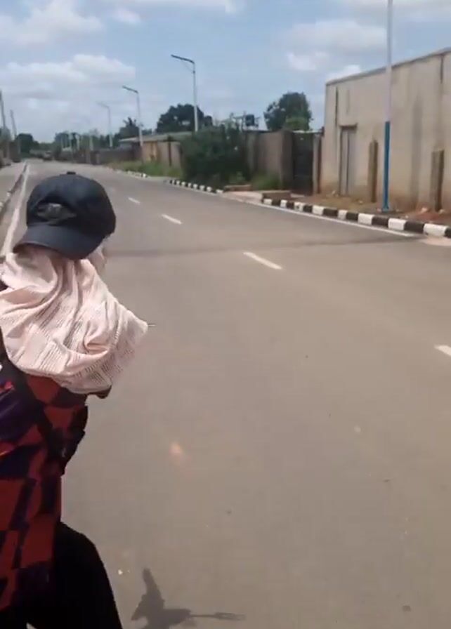 A person wearing a black baseball cap, a striped headscarf that covers the face, a checkered shirt, black pants, and green slippers is standing on the side of a paved road with white lines