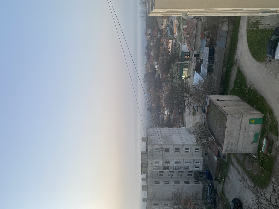 This image presents an elevated, panoramic view of a residential and semi-commercial area in Simeonovgrad, Bulgaria, under a hazy, pale blue to light grey sky. The distant horizon is obscured by a dense band of fog or haze. In the foreground, on the left, stands a large, multi-story, grey concrete apartment building with numerous rectangular windows and a flat roof featuring several chimneys. Multiple vehicles, including a dark sedan and a light-colored SUV, are parked near its base. Adjacent to this building and slightly to the right, a smaller, single-story concrete building with a dark, flat roof is situated. This smaller building has two green doors, and a bench painted with the white, green, and red stripes of the Bulgarian flag rests directly in front of one door. The ground in the immediate foreground consists of sparse green grass patches and unpaved dirt paths, one of which curves towards the bottom right where a part of another dark vehicle is visible. To the right, the left edge of a beige multi-story building, equipped with a white satellite dish, partially frames the scene. The mid-ground reveals a townscape comprising numerous smaller, older residential houses with red-tiled roofs, intermingled with bare deciduous trees. A commercial establishment with a green facade and an illuminated interior is visible within this area. Various fences, sheds, and utility poles are also present. Overhead, stretching diagonally across the upper-right quadrant, are two prominent dark electrical or communication wires. The overall lighting is soft and diffused, with minimal distinct shadows, indicative of the hazy atmospheric conditions. No human subjects are visible within the frame.