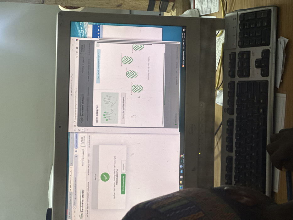 This image depicts an indoor scene in Unguwar Rimi, Nigeria, focusing on a computer workstation. A person, partially visible from the shoulder and back of the head on the left, wearing a patterned cap, interacts with the computer, with their right hand positioned near a mouse. The central object is a large, beige Dell computer monitor displaying two open browser tabs, both running the "NIMC Enrolment Software" (National Identity Management Commission). The left tab shows a "Success" message with a green checkmark, indicating "Applicant data was successfully created with Tracking ID 7Y90GZSL063KWTQ," along with options to "Print Transaction Slip" or "Go Home." The right tab, which appears active, displays a "Scan Fingerprint" interface, showing outlines of two hands and instructing to "Place the Left Four Fingers to capture." Below this, four green, stylized fingerprint icons are visible, with the text "Capturing the Left Four Fingers..." indicating an ongoing or pending scan. The bottom right of the monitor's display shows a system tray widget with "32°C Mostly sunny 1:09 PM 11/5/2021." Below the monitor rests a black HP keyboard with silver accents, positioned on a light-colored desk or table. Papers are visible underneath the keyboard. To the right of the monitor, a vertical wooden object, possibly a carved decoration or part of furniture, is partially visible. The background behind the monitor appears to be a light-colored wall.