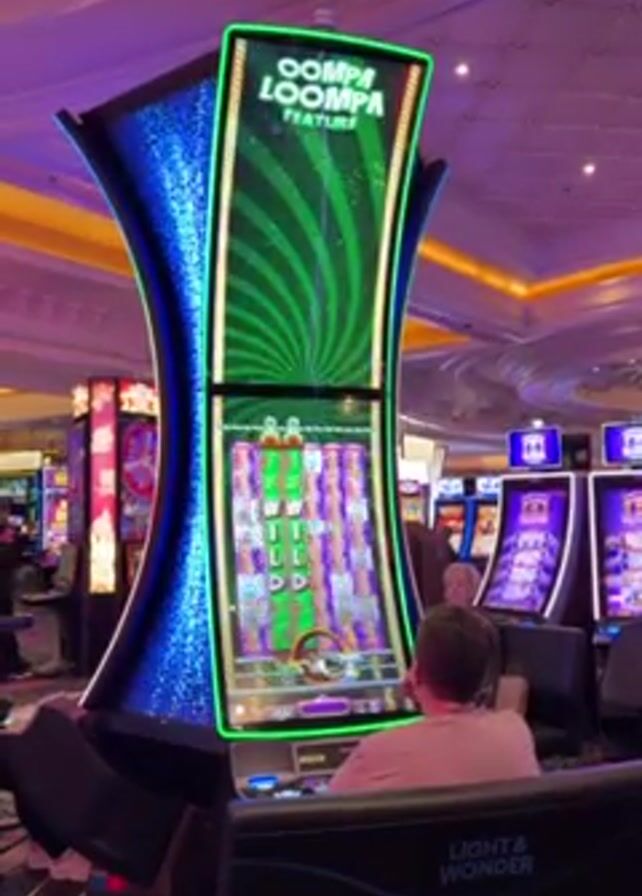 person playing a slot machine in what appears to be a casino. The slot machine is a large, modern one with the name "Oompa Loompa Feature" displayed at the top. It has a curved shape and is brightly lit with green and blue lights. The game is in progress, with the reels spinning and showing various symbols, including the word "WILD." The person playing the machine is sitting in a chair, facing the screen. The casino environment is visible in the background, with other slot machines and people present. The overall lighting is bright and colorful.