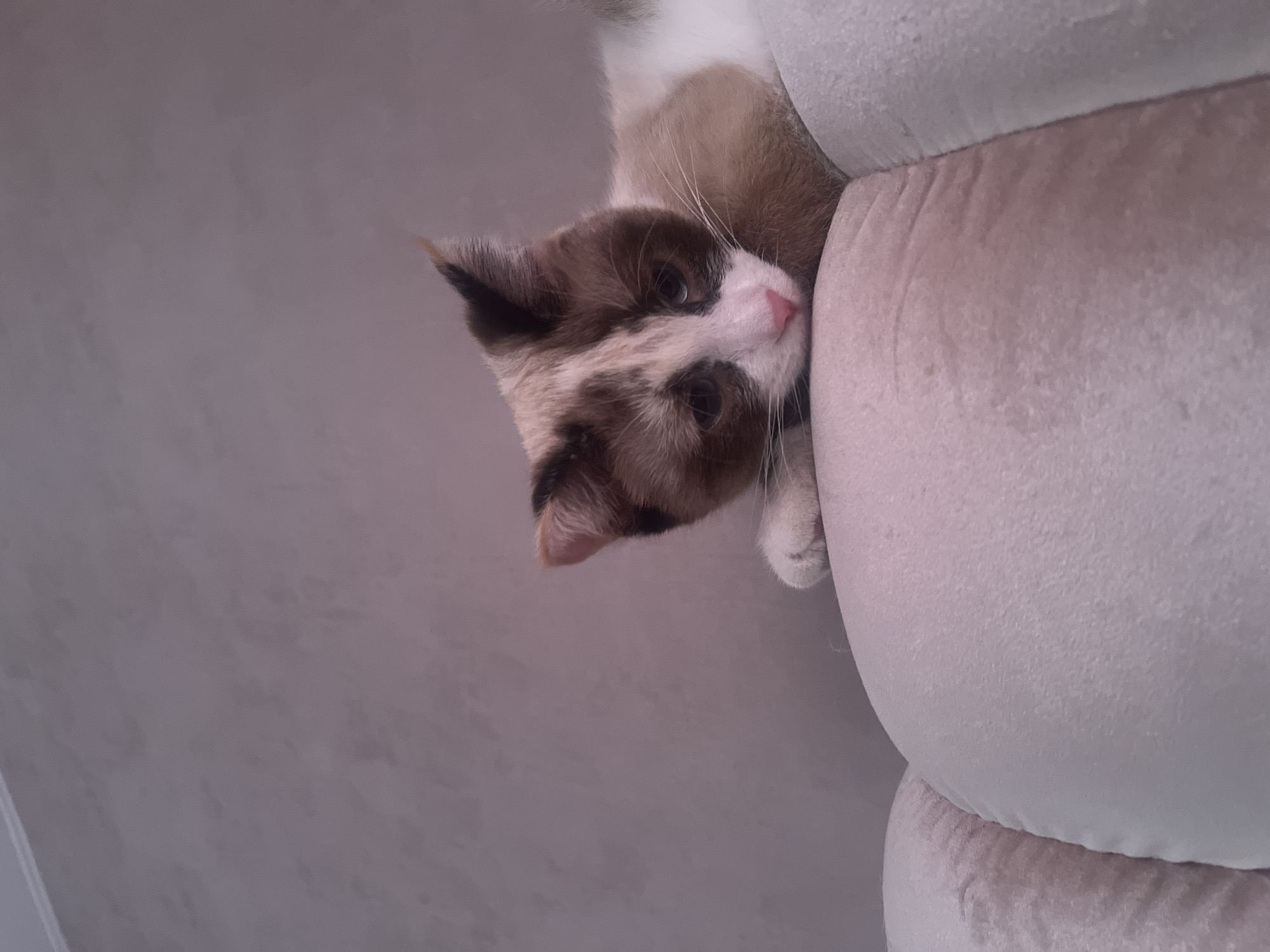 The image captures a domestic cat resting on a light-colored, upholstered sofa or armchair in an indoor setting within Votkinsk, Russia. The cat, predominantly white and light brown with distinct dark brown markings on its ears and around its eyes, features a pink nose and white-tipped paws. Its head is positioned downwards, resting on the plush, segmented surface of the furniture, with its eyes partially open. The background consists of a plain, light purple-grey wall, revealing a faint ceiling line in the upper left quadrant. The scene is illuminated by soft, diffused lighting.