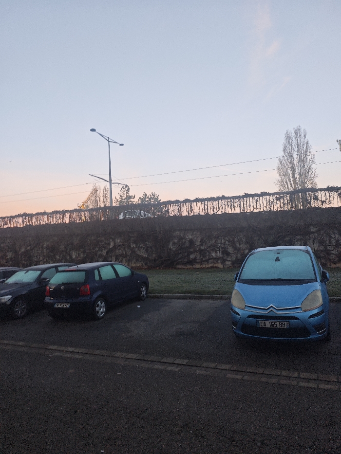 Three cars are parked in a row. The first two cars are dark, and the third car is light blue. The blue car is parked close to the curb, while the two dark cars are farther back. All three cars have frost on the windows and windshield. In the background, there is a concrete wall covered in vegetation and trees. The sky is pale blue with faint pink and orange hues near the horizon. A streetlight is also visible.