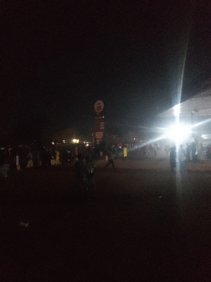 The image depicts a nighttime gathering of people in an outdoor setting. A bright light source dominates the scene, casting strong glare and shadows. A tall sign is visible in the background. Figures are indistinct due to the low light conditions, but appear to be loosely grouped. The overall atmosphere is dark and slightly chaotic, illuminated primarily by artificial lighting. The foreground is indistinct, suggesting a focus on the gathering further away.