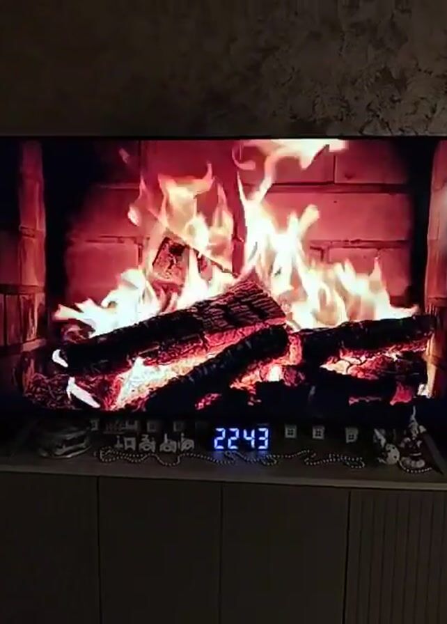 living room decorated for the holidays. A large TV displays a fireplace scene with flickering flames and burning logs. The TV sits on a light-colored cabinet adorned with small decorative figurines and a digital clock displaying 22:43. To the left of the TV is a large black speaker with blue lights. Further to the left stands a Christmas tree decorated with white and silver ornaments, as well as small white lights. A decorative sock hangs on the wall next to the speaker. The overall environment suggests a cozy, festive atmosphere in a home.