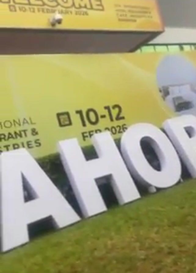 close-up view of a large, white, 3D sign that spells out "MEGAHORECA." The sign is placed on a patch of green grass. Behind the sign, there's a yellow banner with text indicating the event dates "10-12 FEB 2026" and "INTERNATIONAL RESTAURANT & INDUSTRIES EXHIBITION." Above this banner, another sign displays the word "WELCOME" in yellow text on a yellow background, along with the dates "10-12 FEBRUARY 2026". The background also suggests a building facade, possibly an exhibition hall, with hints of a modern architectural style. The camera appears to be handheld, giving a slightly shaky perspective.