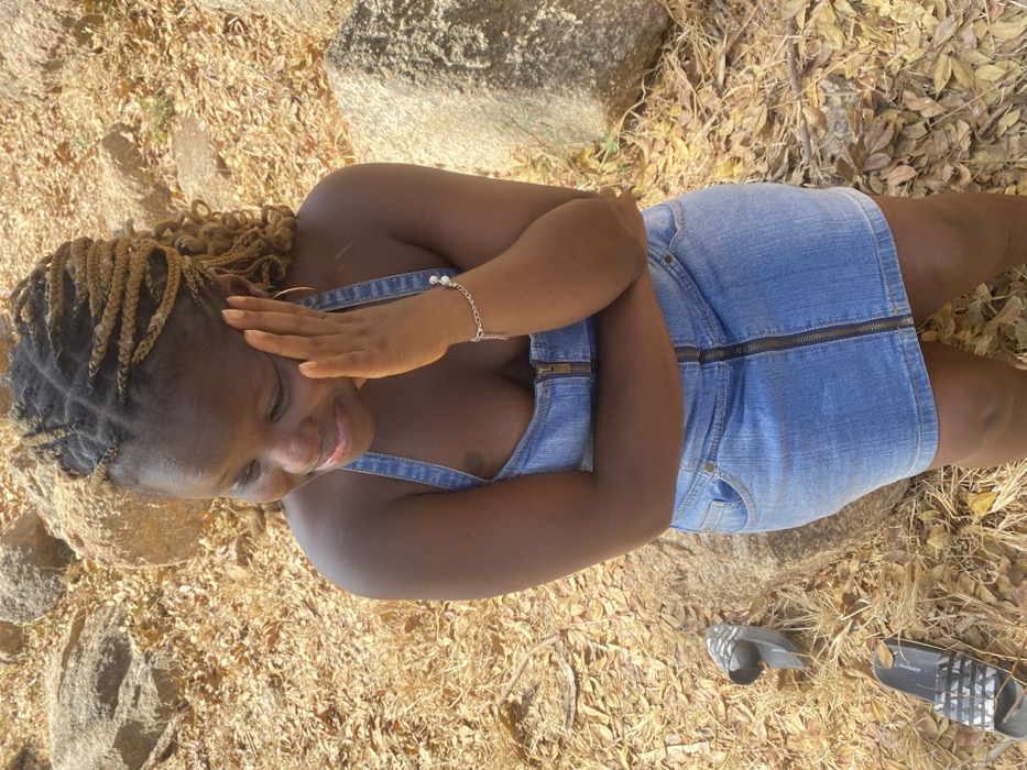 The scene depicts a female individual situated outdoors in the city of Nabatum, Nigeria. The environment is characterized by dry, light brown foliage covering the ground and numerous light-colored rock formations. The subject has dark skin and her hair is styled in dark braids with blonde tips. She is attired in a light blue denim halter-neck mini-dress with a visible vertical metal zipper from the chest to the hem and two small hip pockets. On her right wrist, she wears a silver-colored chain bracelet with two white spherical beads, and a large gold-colored hoop earring is present on her right ear. Her left hand is raised, with fingers touching her left cheek/jawline. Her head is tilted downwards and to her right, exhibiting a subtle smile while her gaze is directed away from the camera. Two black slides, featuring white stripe patterns on their straps, are visible on the ground to the lower left of the subject.
