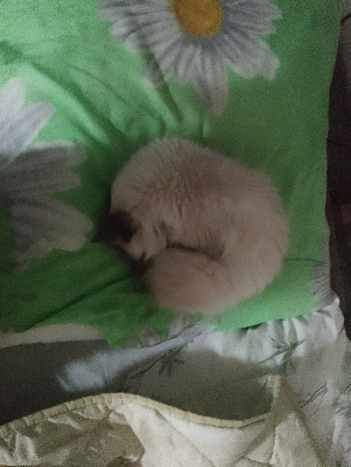 - "A tan cat is curled up on a green pillow with white daisy patterns" by FM-zZnPi1, licensed under CC BY 4.0