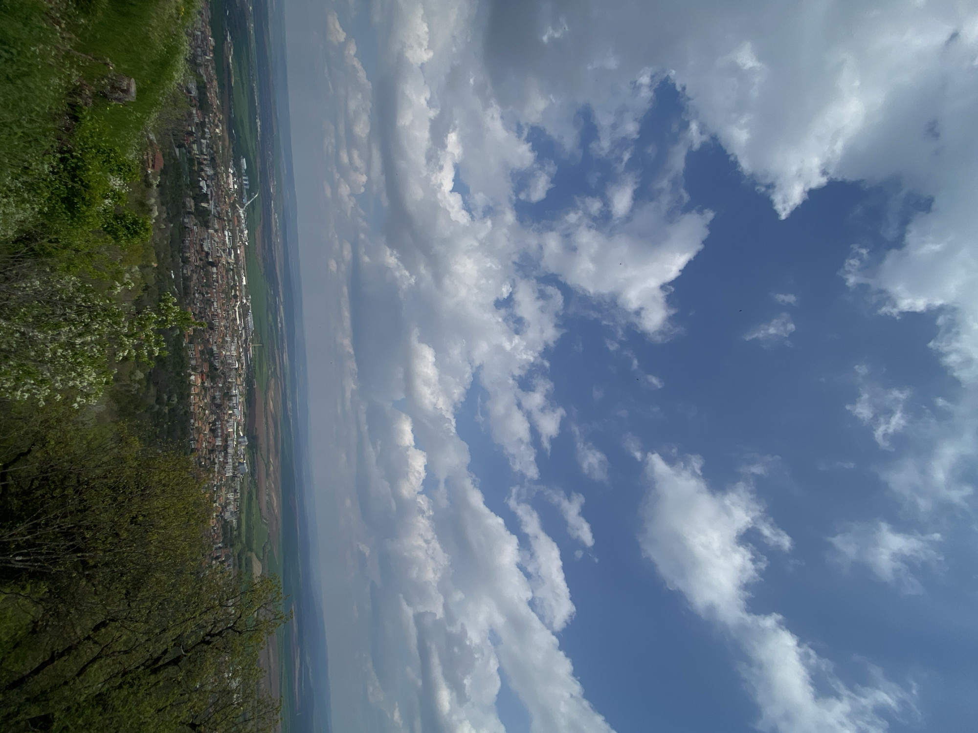 The image presents a panoramic view from a high vantage point in Lyaskovets, Bulgaria. The foreground on the left shows lush greenery consisting of trees and grass, suggesting a hillside or elevated area. A densely populated urban area, presumably Lyaskovets, stretches out horizontally from the middle left. Buildings, houses, and structures are visible, indicating a residential and possibly commercial zone. Beyond the town, a flat landscape unfolds, likely agricultural fields or plains, marked by variations in color and texture. The sky dominates the right portion of the image, filled with numerous white and grey clouds scattered across a blue background. The perspective suggests the photograph was taken at an angle, causing the horizon to appear tilted.