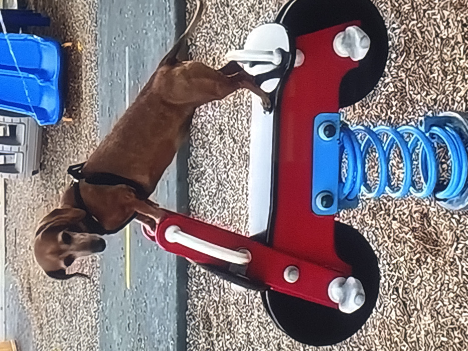 A brown dachshund is on a red, white, and black seesaw with blue springs at a playground. The dog is wearing a black harness and appears to be mid-motion. The ground is covered in wood chips. A blue plastic object is visible in the background.