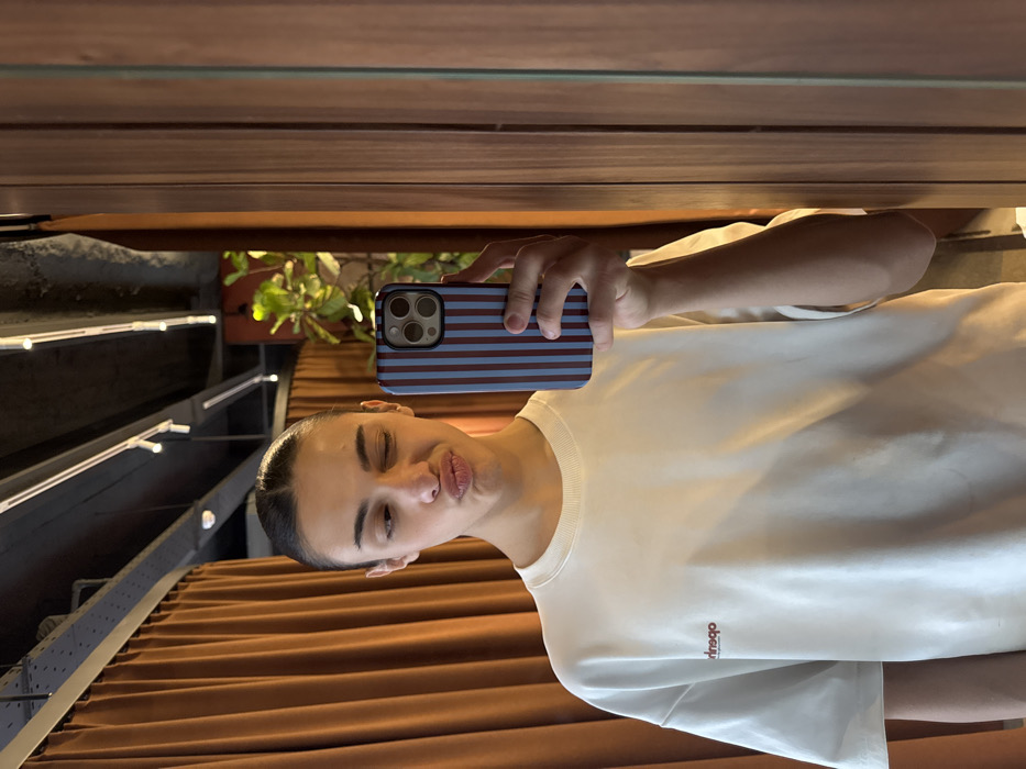 A young adult individual, likely female, with dark hair pulled back, is depicted in a mirror selfie taken in an indoor setting