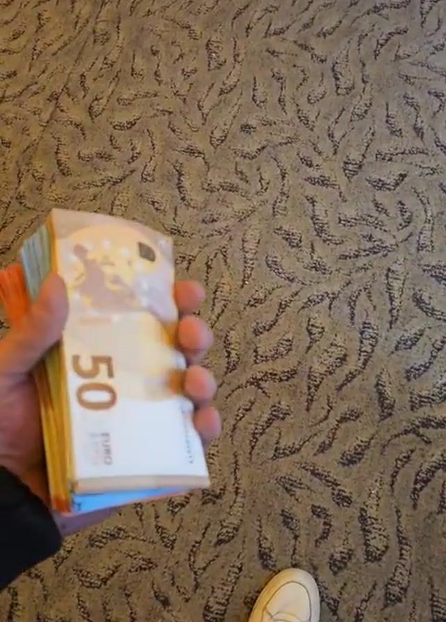A person holds a stack of euro banknotes. The visible bill on top is a 50 euro note. Several other bills are also visible, in the colors of 5, 10, 20, and 50 euro notes. The person’s leg and white sneaker are visible at the bottom of the frame. The background consists of patterned carpet. Music can be heard.