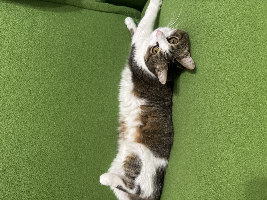 - "A cat with white, brown, and black fur lies on its back on a green couch" by FM-OscNx2, licensed under CC BY 4.0