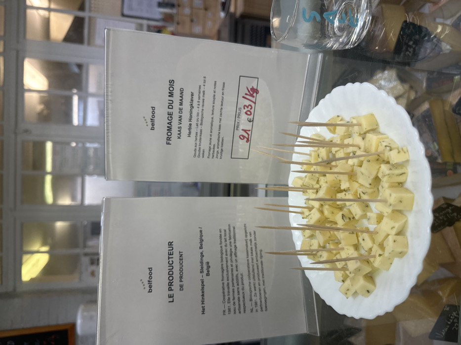 The scene depicts an interior view of a specialty food shop, likely a cheese store or deli, located in Brussels, Belgium