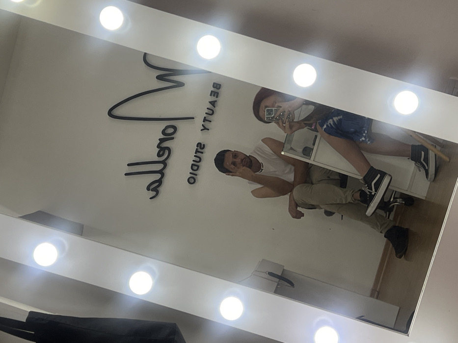 A mirror reflects two people, likely taking a photo of themselves. One is seated, wearing a white t-shirt and khaki pants, with black high-top sneakers. The other is standing behind, holding a phone and wearing a short denim skirt and black high-top sneakers. The mirror is surrounded by lights and reflects a sign that reads "Morella Beauty Studio." A black bag is visible at the bottom left of the frame.