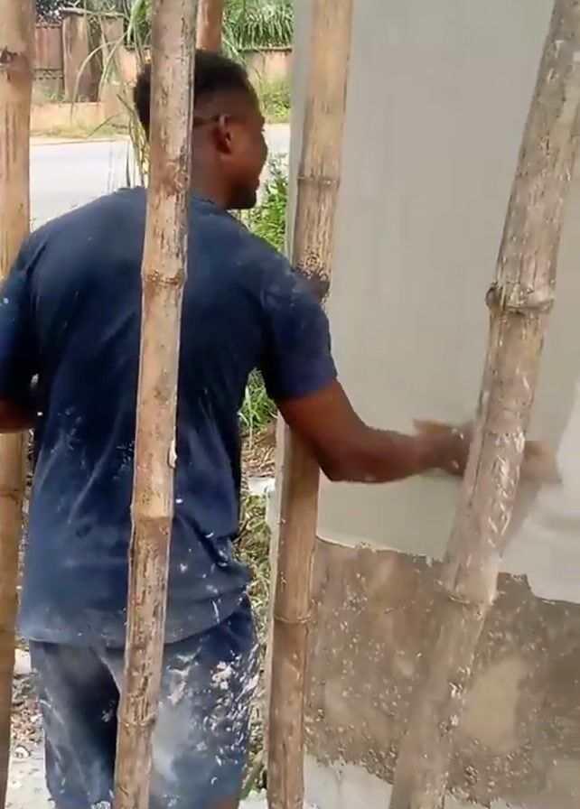 man plastering a wall using a trowel. He is standing between three bamboo sticks that act as a ladder. He is wearing a navy blue t-shirt and shorts splattered with white paint. He applies the plaster to the wall and smooths it out. Vegetation can be seen surrounding the building and in the distance.