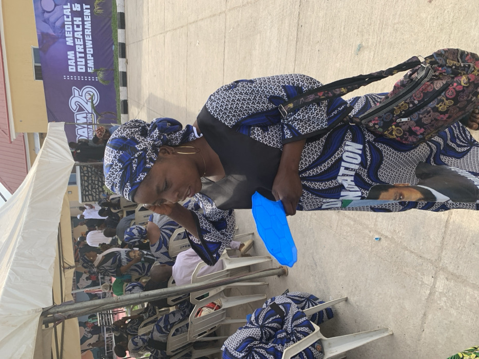 This image depicts an outdoor community event taking place in Okene, Nigeria. In the foreground, a woman is captured in a mid-shot, positioned slightly to the right of the frame's center. She is looking towards the left with a slightly open mouth. She wears a blue, white, and black patterned headwrap and a matching ankle-length dress featuring a black panel on the upper chest. The lower part of her dress displays an image of a man and the text "FOUNDATION." She wears gold hoop earrings. Her right hand is raised to the side of her head, while her left hand holds a folded blue object, possibly a fan or a small umbrella. A multi-colored patterned shoulder bag hangs from her left shoulder. Behind her, under a large white canopy tent, numerous individuals are seated on white plastic chairs. Many of these attendees wear attire similar to the foreground woman's, featuring blue, white, and black patterns. Other individuals, including men in traditional white garments, are visible standing further back within the gathering. The ground surface appears to be light-colored concrete or pavement. In the background, a prominent purple banner is displayed, bearing the text "DAM 25 FOUNDATION" and "DAM MEDICAL OUTREACH & EMPOWERMENT." Beyond the banner, a light-colored building with a red roof is visible.