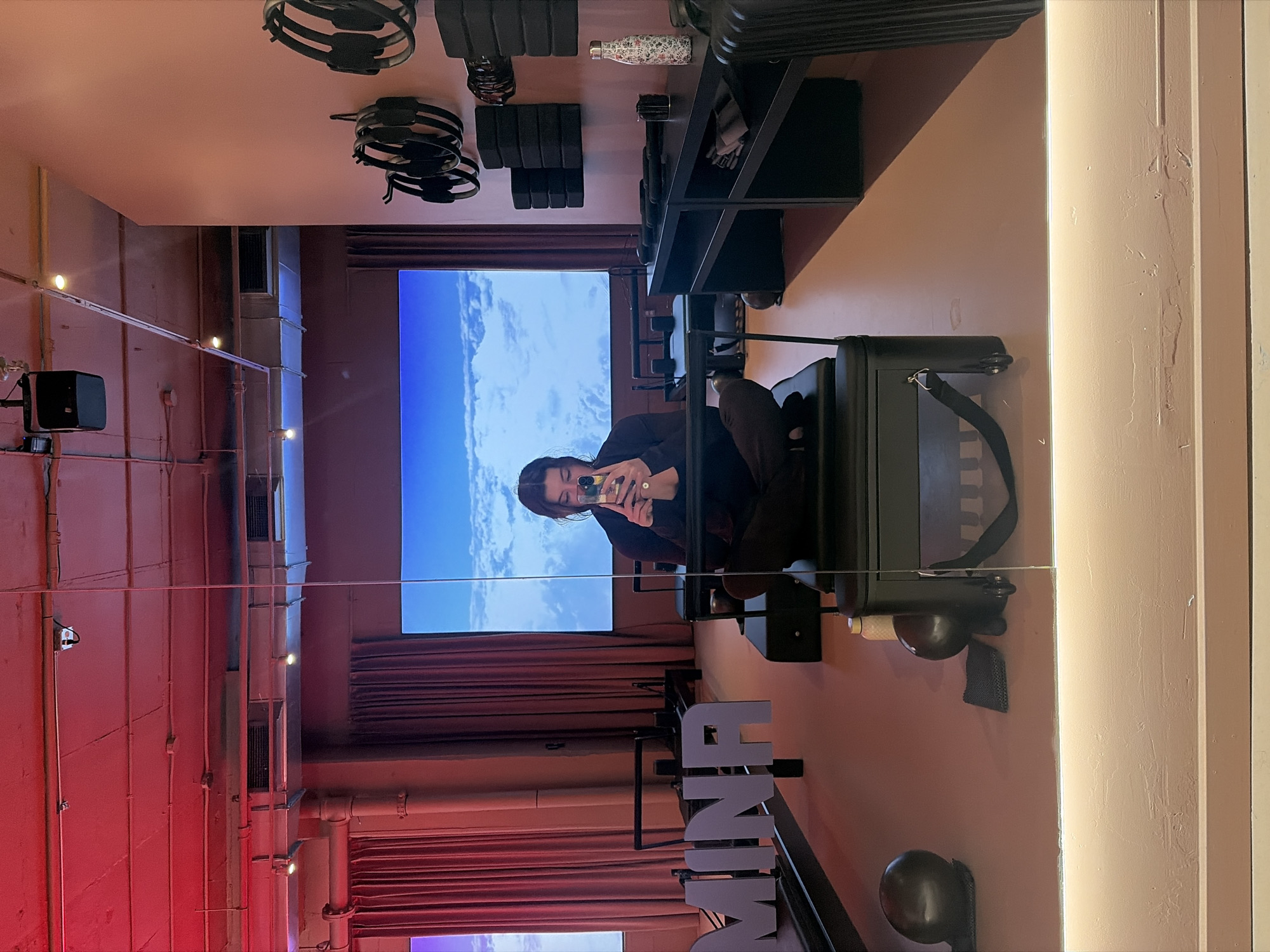 The image appears to be an indoor shot of a person reflected in a mirror. The person is holding a phone and taking a selfie in the mirror. Behind the person is a screen displaying a blue sky with white clouds. There are also red curtains visible in the background. The words "VINNA" are displayed below the mirror. In the ceiling, there are fitness training headphones. Based on the lighting and the overall aesthetic, the location could be a gym or a fitness studio in Montreal, Canada. The image provides details of an interior space with fitness training accessories.