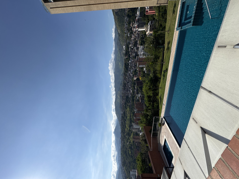 The image displays a panoramic view of Cali, Colombia, from an elevated vantage point, likely a high-rise residential or hotel complex situated on a hillside overlooking the city