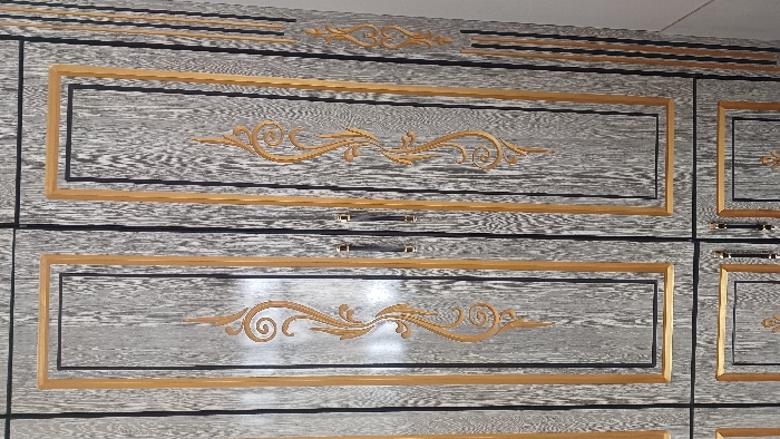 The image displays a multi-paneled cabinet or wardrobe located in Kasansay, Uzbekistan, within an interior setting. The furniture features a light grey surface with a distinct vertical wood-grain pattern, interspersed with thin black vertical lines. Prominent gold ornamentation frames various panels and forms intricate scrollwork designs. The central upper section includes two doors, each defined by a gold rectangular frame with an inner black border. Within these central panels, elaborate gold curvilinear scrollwork extends vertically. Two black, vertically oriented handles, accented with gold, are affixed to the center of these doors. Additional panels are visible to the left and right, and a horizontal division suggests a lower section of the furniture, also detailed with gold framing and scrollwork, including a stylized heart-shaped motif on the upper right panel. No individuals or actions are present in the frame.